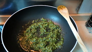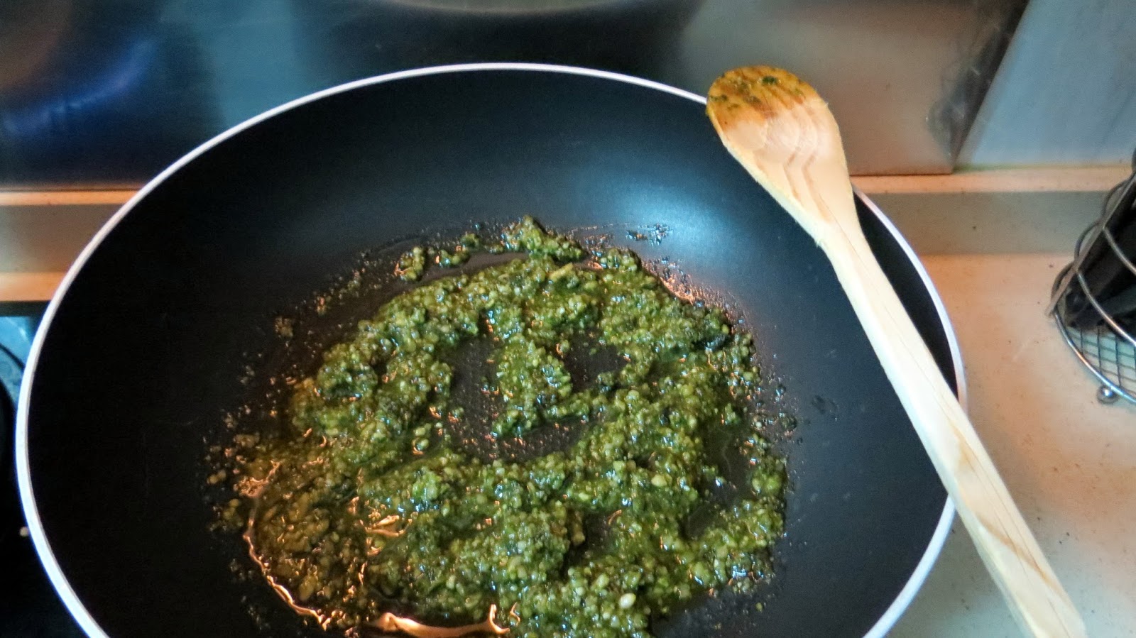 Colocar o azeite num tacho ou frigideira, deixar que aqueça um pouco, juntar o pesto e misturar bem.