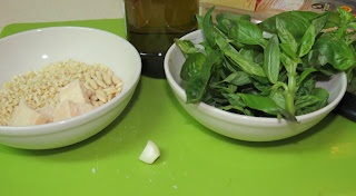 Tinha um ramo de manjericão a estragar-se no frigorífico, e decidi fazer um molho pesto antes que as ervas ficassem totalmente inutilizadas. Retirei mais de metade das folhas e ramos que não estavam em condições e reservei as folhas que estavam boas e restaram-me muito poucas, mas deu para fazer a quantidade suficiente paea juntar a uma massa ou a uma pizza para 2 a 3 pessoas. Nada mal!