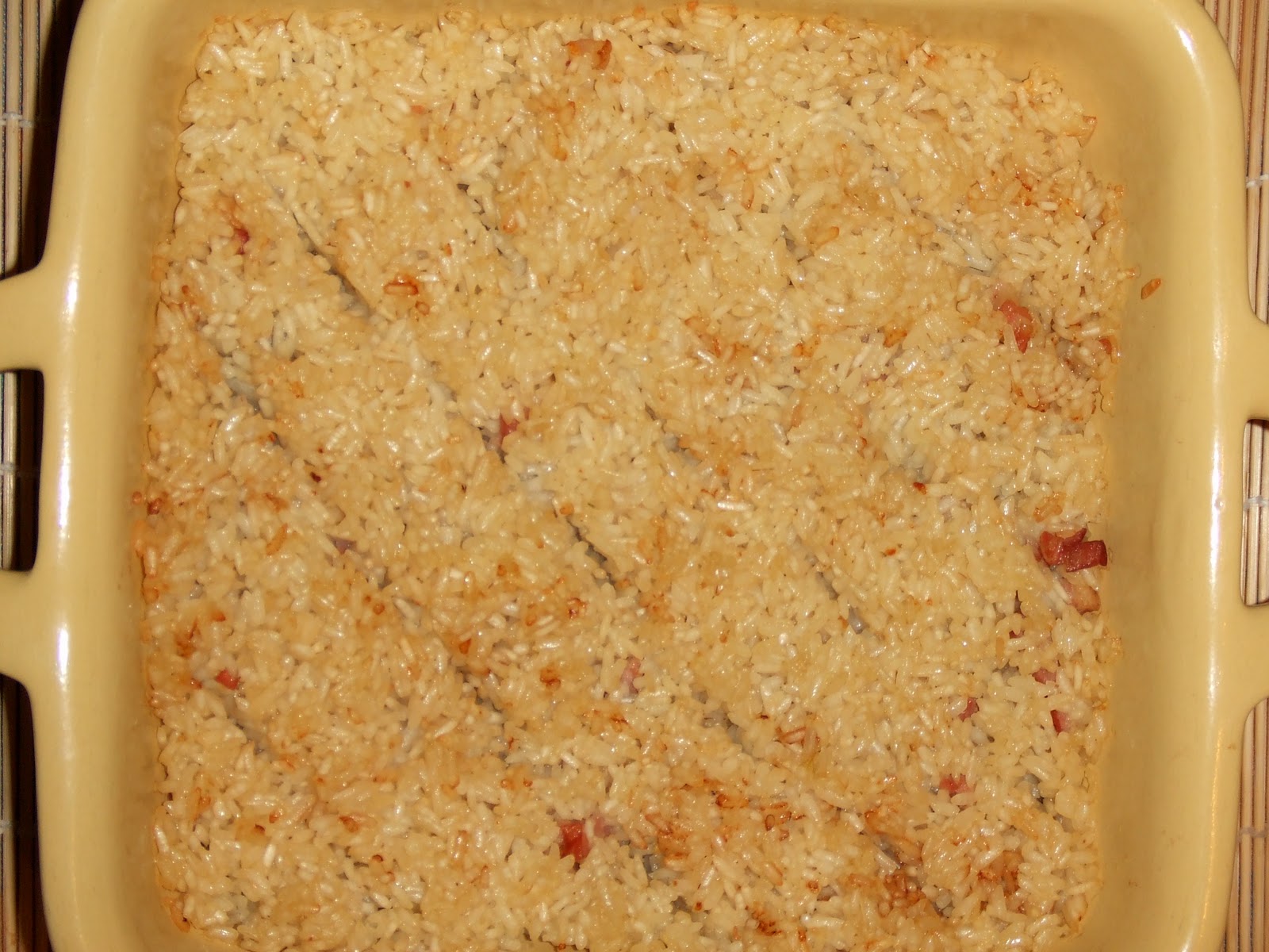 Entretanto desfiar o pato e cortar o chouriço aos bocados e colocar num tabuleiro para ir ao forno. Cobrir com o arroz e levar 10 minutos ao forno pre-aquecido a 180ºC.