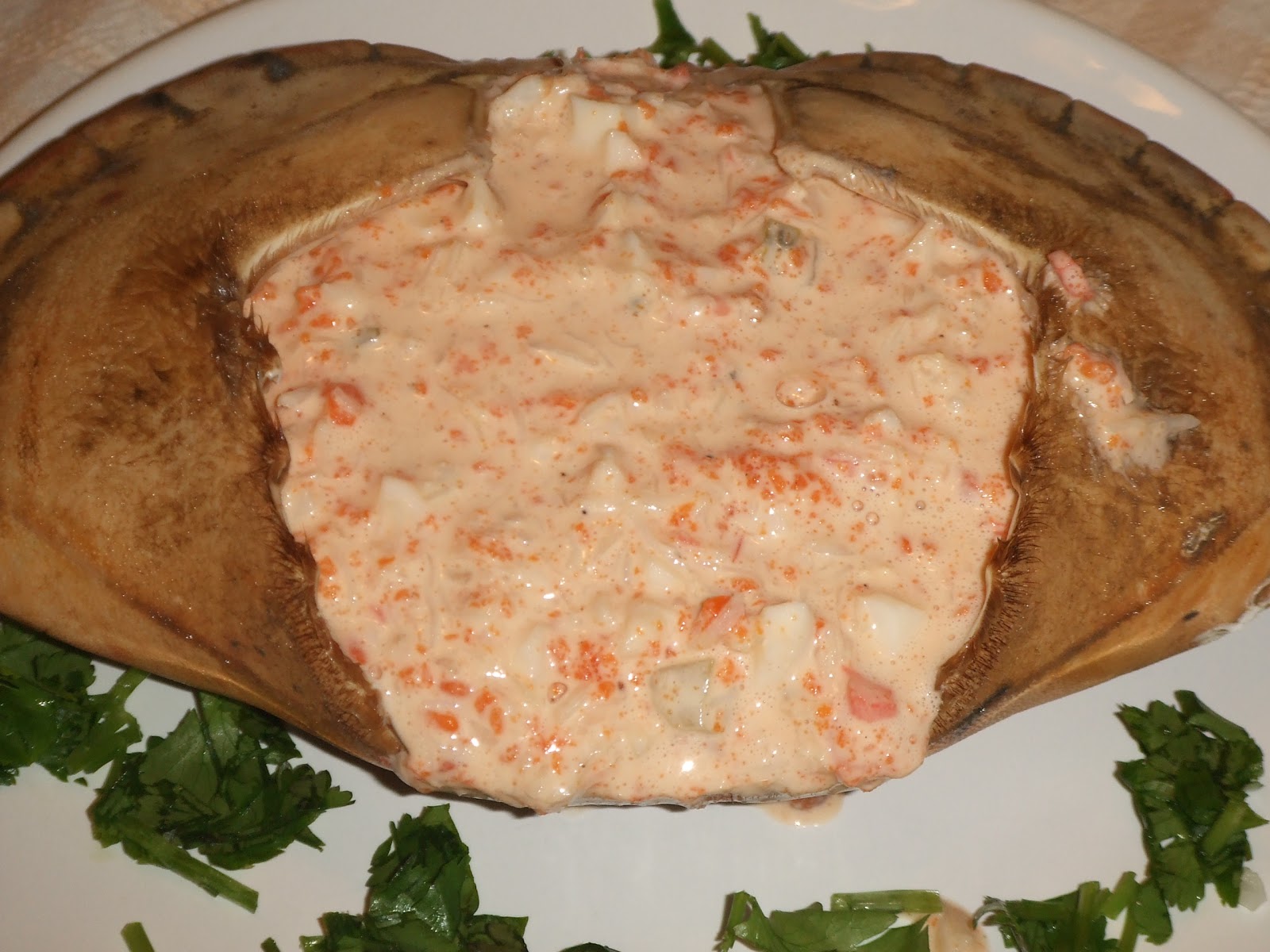 Recheia-se a carapaça previamente lavada só com água. Deixar no frigorifico 1 hora antes de servir.