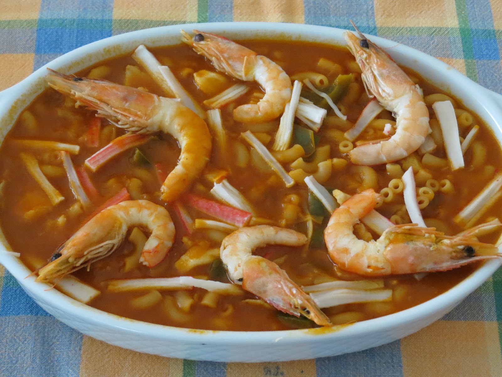 Picar a cebola, o pimento cortado aos bocadinhos e o alho e levar ao lume para refogar com o azeite, cerca de 10 minutos em lume branco, sem queimar, mexendo sempre. Deitar metade da água e colocar o tomate e o caldo de peixe e deixar cozinhar por 15 minutos. Adicionar a massa, a restante água e o peixe cortado aos pedaços e deixar levantar fervura por cinco minutos, sem esuqecer de ir mexendo para a massa ficar soltinha e juntar as gambas e deixar estufar mais 10 minutos.