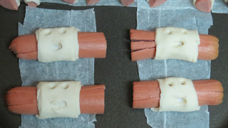 Para as múmias, dar 2 cortes nas salsichas para fazer os braços, e na parte inferior das salsichas dar um corte para dividir a salsicha ao meio como que a fazer umas pernas.