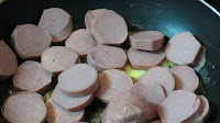 Levar a margarina ao lume e deixar derreter, juntar as salsichas e deixar corar um pouco em lume baixo para não queimar a margarina.