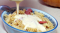 Acrescentar o molho de 4 queijos e envolver para que a massa e as salsichas fiquem envoltas em molho.